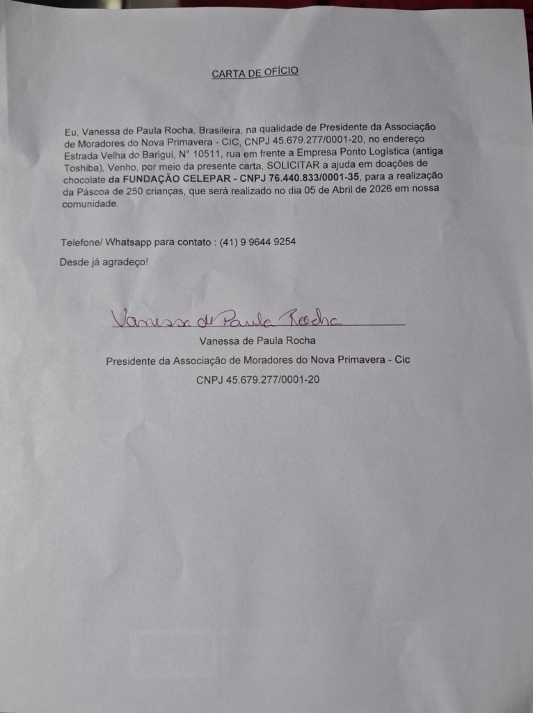 Assim como nos últimos anos, a Funcel realiza mais uma edição da Campanha Solidária de Páscoa, iniciativa que busca mobilizar os associados para tornar essa data ainda mais especial para as crianças da Comunidade Nova Primavera, localizada no bairro CIC, em Curitiba.